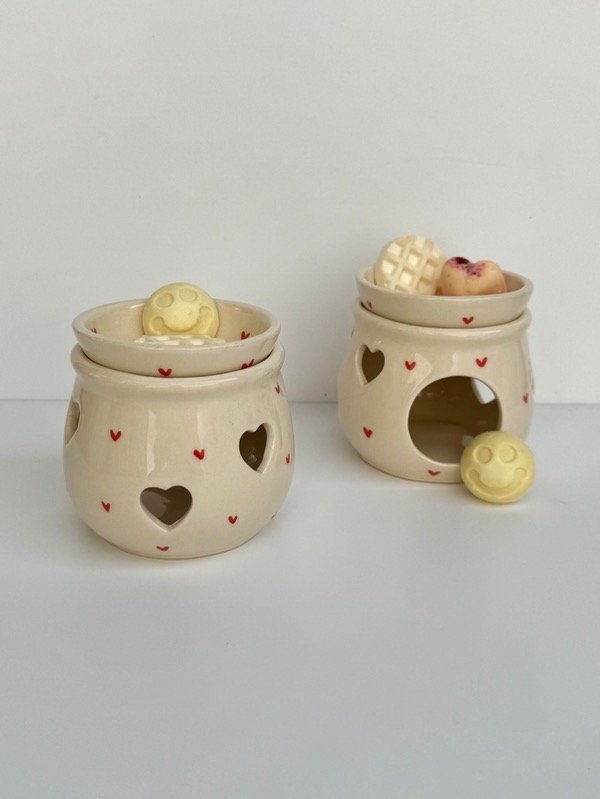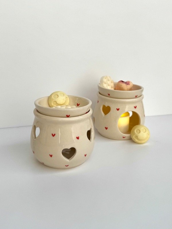 Hornito con plato para esencias desmontable, natural con corazones y con corazones calados.