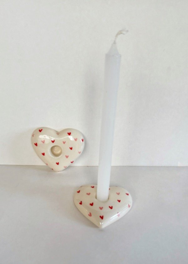 Set de dos candelabros en forma de corazón con corazoncitos rojos y rosas.