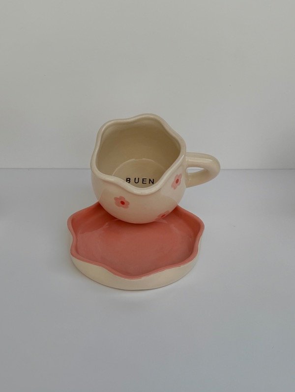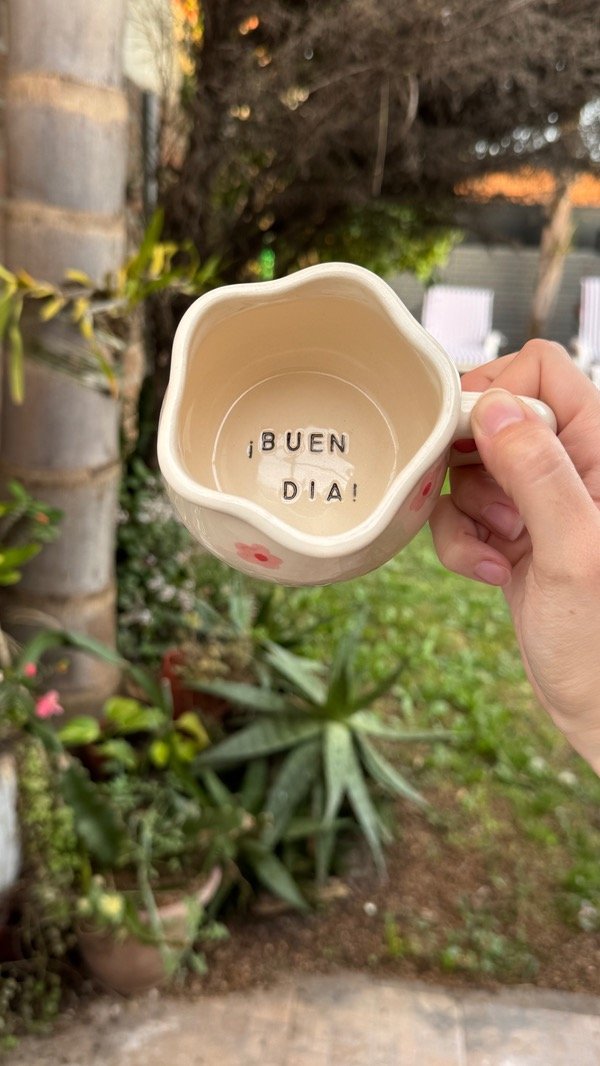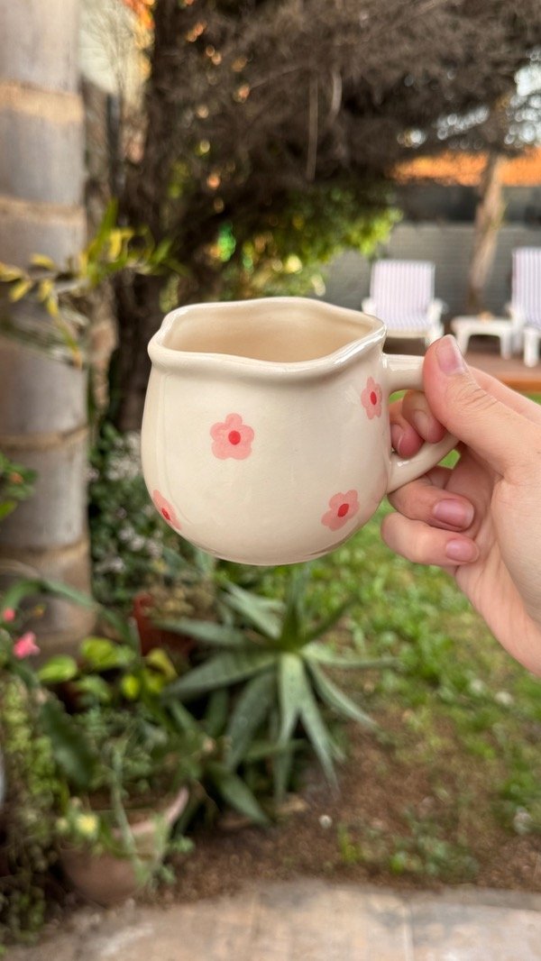 Tacita con borde en forma de flor y flores, puede contener hasta 350cc