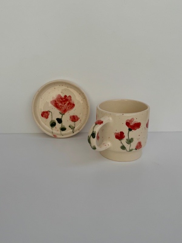 •Taza apilable con flores tipo acuarela, puede contener hasta 300cc