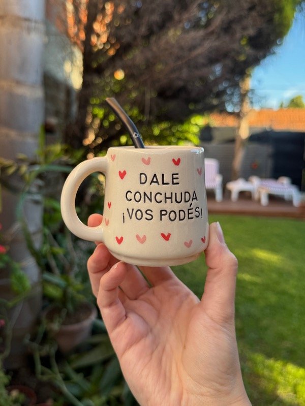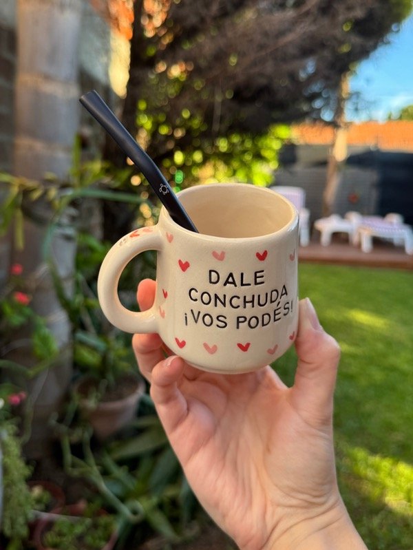 Mate con frase, corazones y bombilla haciendo juego (según disponibilidad)