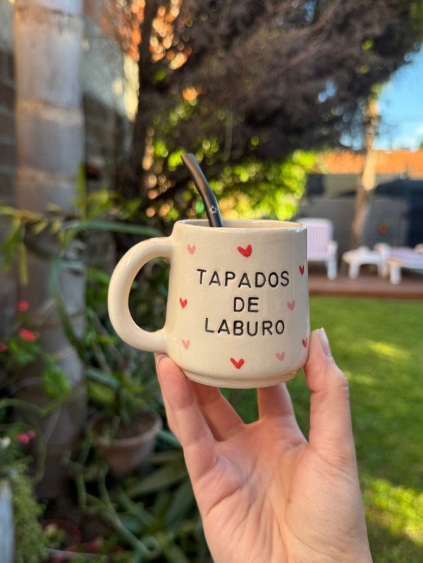 Mate con frase, corazones y bombilla haciendo juego (según disponibilidad)